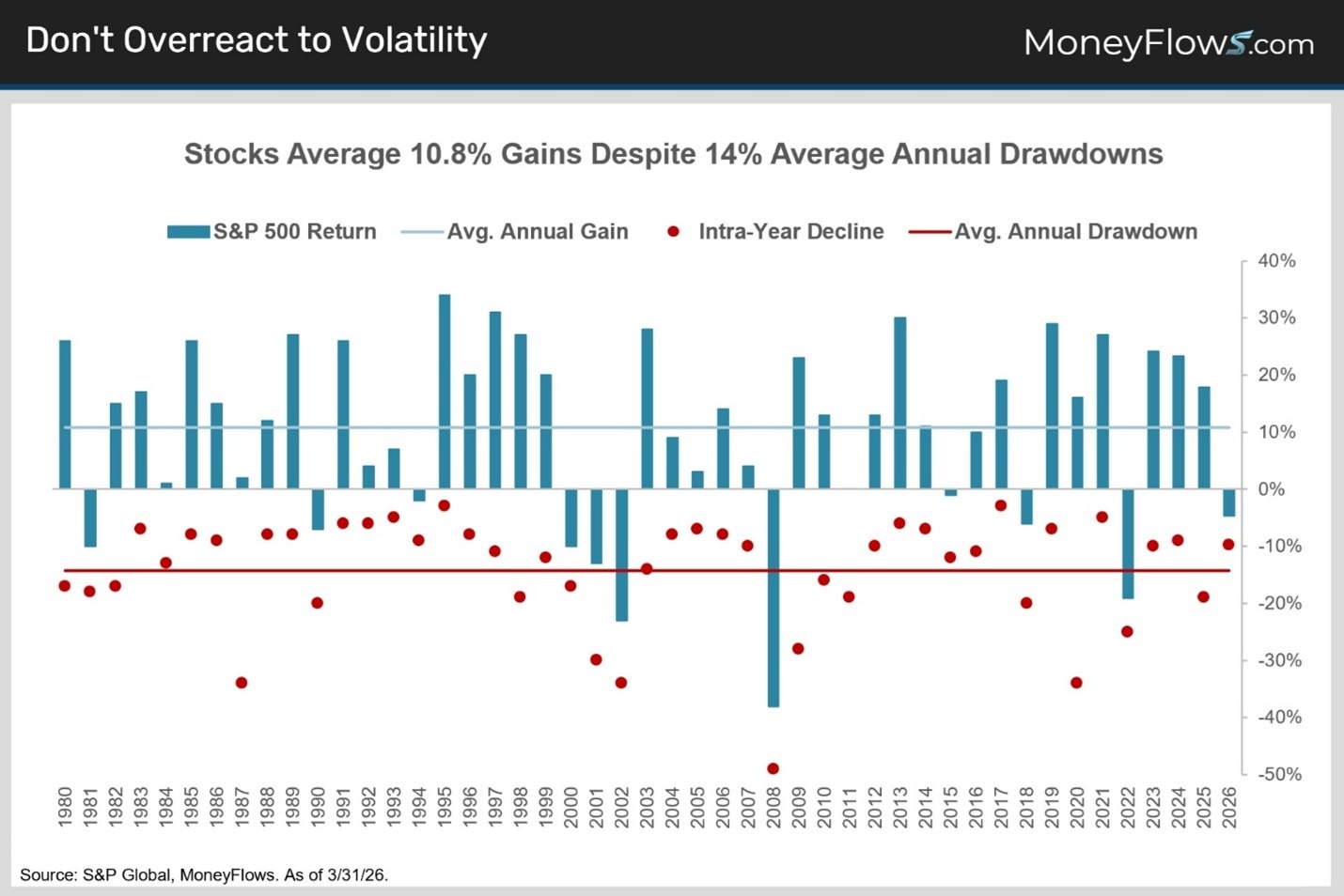 History ALSO suggests throwing in the towel would be a massive mistake. Since 1980, the S&P 500 averaged 10% annual gains despite suffering through average annual peak-to-trough drawdowns of 14%.