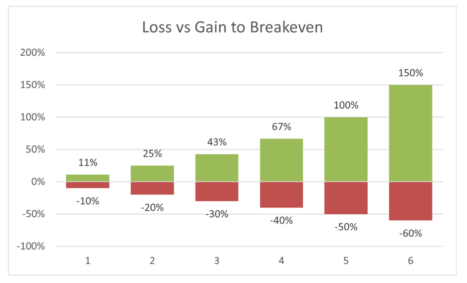 In layman's terms, all this means is the less loss you have to recover, the less gain you need to break even or get ahead: