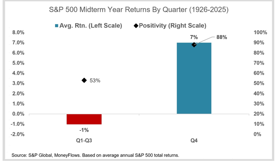 Still, from historical standpoint, since 1926 the S&P 500 averages a 7% ramp in the fourth quarter of midterm years with an 88% positivity rate: