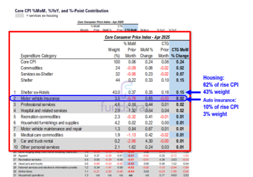 Shelter and auto insurance remain the largest contributors, punching significantly above their weight. Shelter contributed 0.15%, which was 62% of the overall rise. And auto insurance contributed plus 0.02%, which was 10% of the total inflation gain: