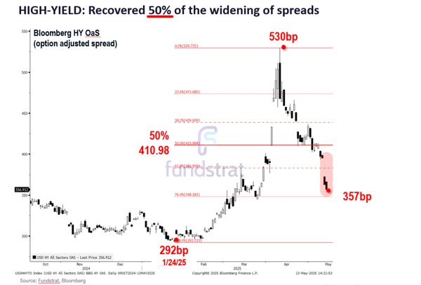 Next, the popular narrative is there is significant economic weakness ahead. However, the high yield market keeps rallying fiercely, indicating no recession on the horizon: