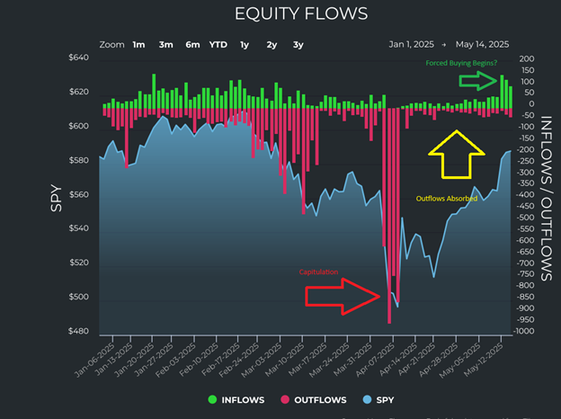 First, capitulation sends stocks lower. Then outflows dry up. Afterwards, forced buying eventually takes over and sends markets higher.