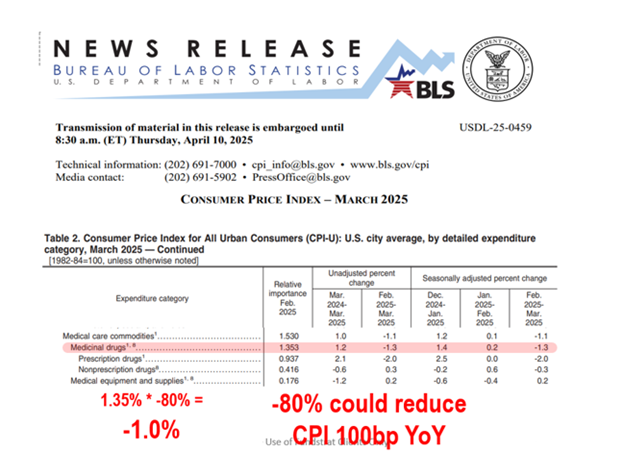 Drugs comprise about 1.35% of the current consumer price index basket. An 80% cost reduction would be a 100-basis-point reduction in CPI. In other words, year-over-year CPI would drop from 2.8% to 1.8%:
