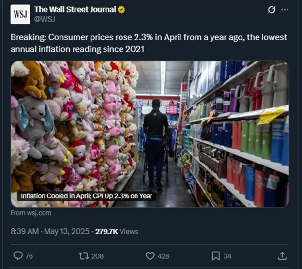 Inflation is currently tracking lower than the consensus expectation and hit a headline figure not seen in years.