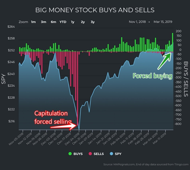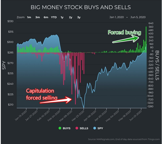 Let’s start with the “big money” professional investor money flows during the 2020 COVID crash. First there was clear capitulation before selling seemingly dried up out of nowhere. Then, forced buyers stepped up.
