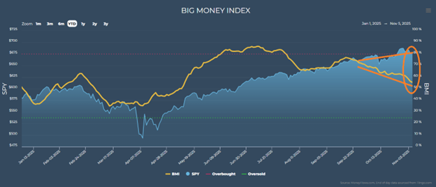Understanding our view on the macro picture, let’s turn to what we’re seeing underneath the market’s surface. First, MoneyFlows’ trusty Big Money Index, which is a 25-day moving average of institutional investor buys and sells netted, drifted lower to a fresh six-month low of 55.6%, even as markets hit new highs: