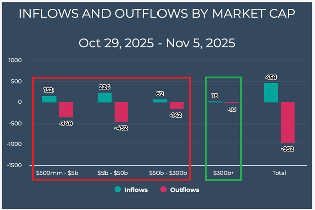 To illustrate this disconnect, notice how over the past week outflows of small- and mid-cap stocks have outweighed inflows by a two-to-one ratio as mega-caps saw a two-to-one inflow ratio: