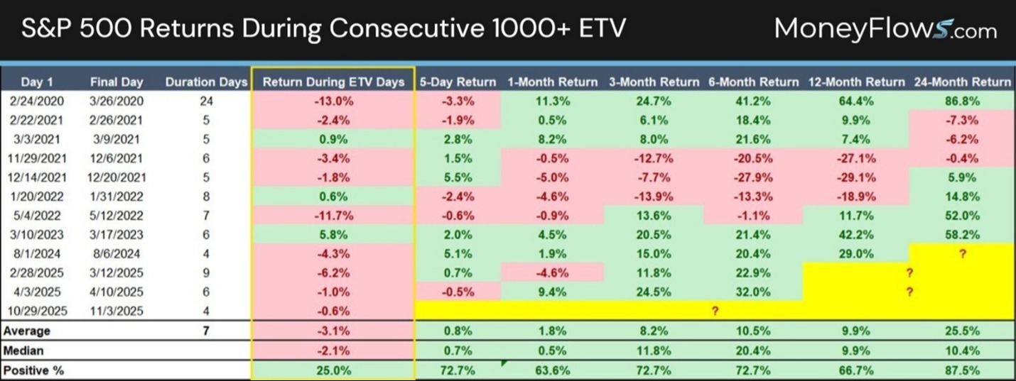 Understanding this is important because when we are in these periods of consecutive days of elevated trading, the market performance is almost unanimously in the red: