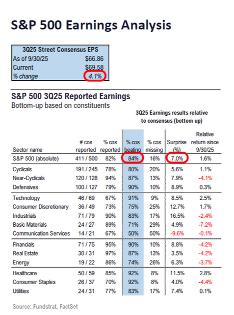 Let’s start with what’s most important: earnings fundamentals. As of this writing, it’s the stretch run of third-quarter earnings season with 411 of the S&P 500* companies reporting. Of them, 84% beat earnings estimates and the overall surprise beats are now sitting at 7%.