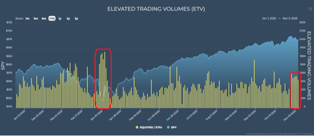 The following chart shows elevated trading volumes. When bars increase in size, it indicates there's a lot of trading happening under the surface. As you can see on the far right, there have been six straight days of 1,000 or more stocks and exchange-traded funds trading at outsized volumes: