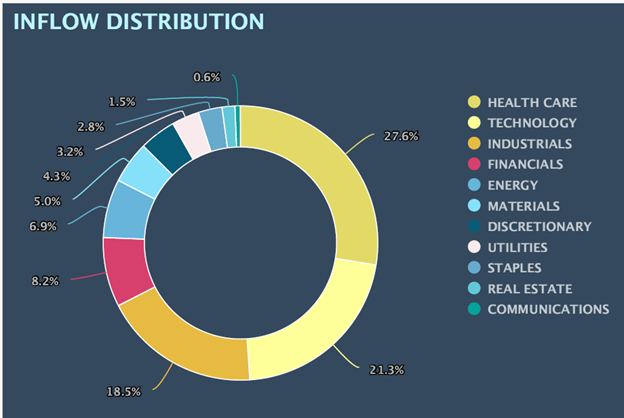 But it’s interesting to note how at the same time technology, industrials, and financials were also three of the top four sectors receiving inflows, accounting for 48% of total inflows during the same time: