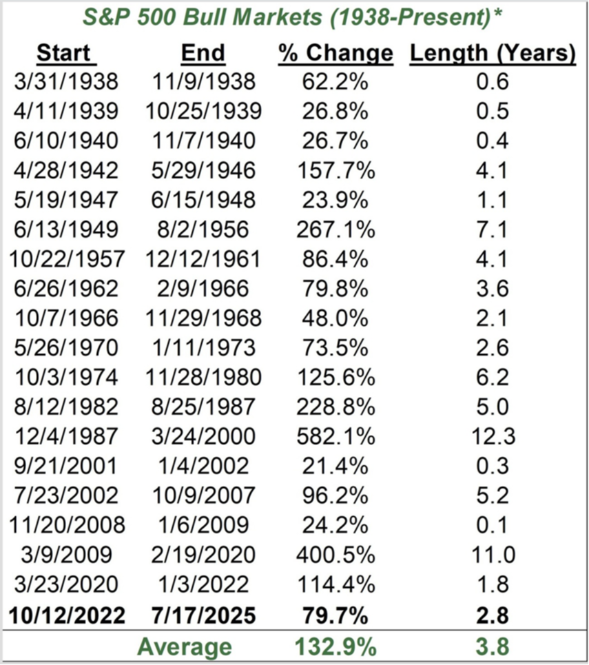 While there's a strong argument that we're in the very beginning of a new bull market, let's instead assume that isn't the case and this bull market began in October 2022. As such, we’re 2.8 years in and up only 80% thus far. Thus historical averages would indicate there is a full year and 53% of upside yet to come:
