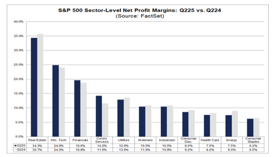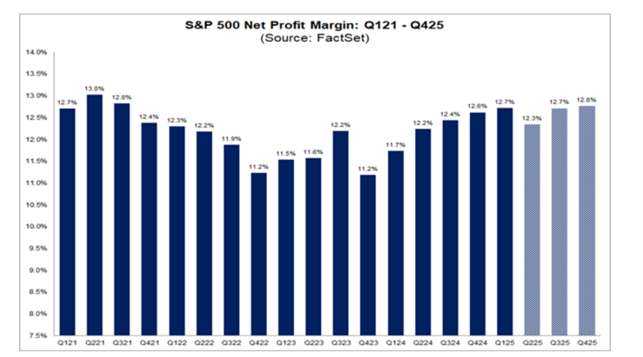 Net profit margin is especially important now given the concerns about tariffs and higher costs. Halfway through reporting season, we’re not seeing evidence of profit pain as the quarterly blended net profit margin for the S&P 500 is 12.3%, which is above the year-ago rate of 12.2% and the five-year average of 11.8%: