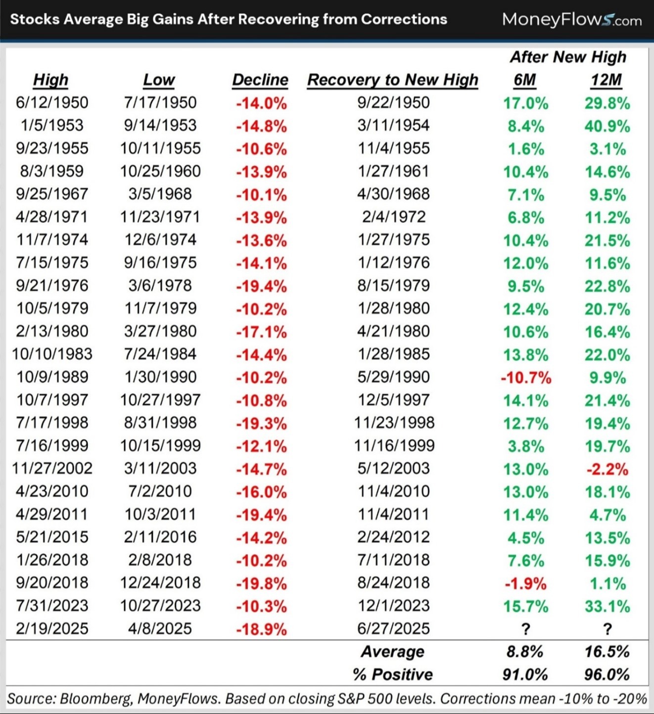 First, since 1950 there were 23 corrections in the S&P 500 (declines of 10%-20%). Our friends at MoneyFlows illustrate how stocks have historically performed after they've recovered their correction losses: