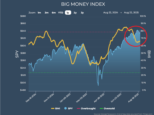 The all-important Big Money Index (BMI), which is MoneyFlows’ proprietary 25-day moving average of “big money” investor activity, fell from overbought territory: