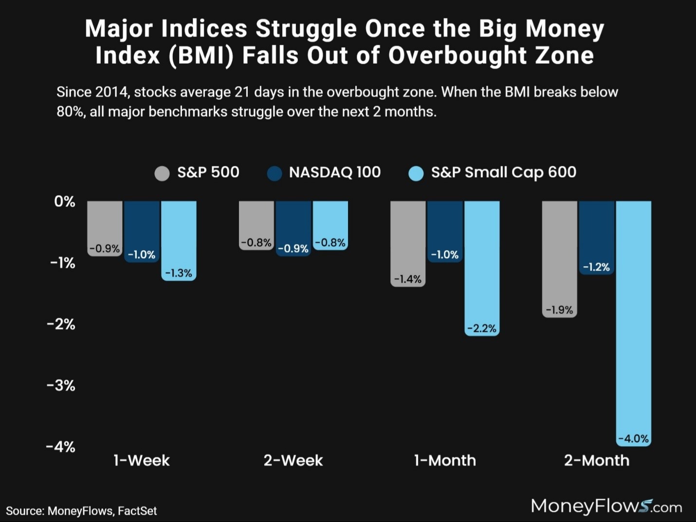 We prepared readers for this situation a month ago when saying returns after the BMI leaves overbought territory are suboptimal, to say the least: