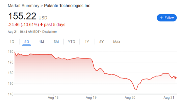 Palantir# (PLTR) was down 13.61% after a 107.6% YTD rise: