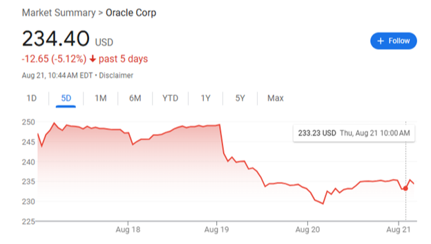 Lastly, Oracle# (ORCL) dropped 5.12% in the past five days alone but remains up 41% YTD:
