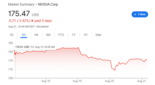 NVIDIA# (NVDA) fell 3.42% over the past five days, but it’s up 26.4% YTD: