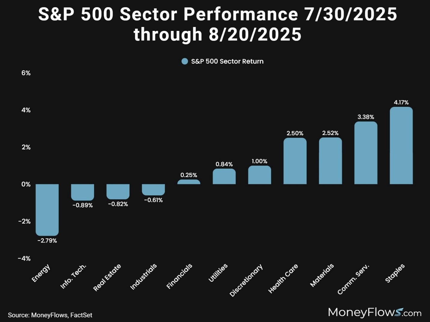 Sector-wise since the start of August, growth areas have fallen as laggards rose: