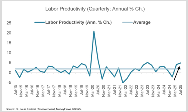 However, we’re already beginning to see transformative increases in productivity. Third-quarter 2025 productivity rose 4.9% from a year ago, which is more than double the 1.9% long-term average: