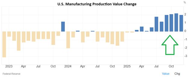 We all know numerous companies have been forced and/or incentivized to reshore their operations to the U.S. to avoid Trump 2.0 tariffs. This effect is being realized via a significant increase in manufacturing production value in the second half of 2025: