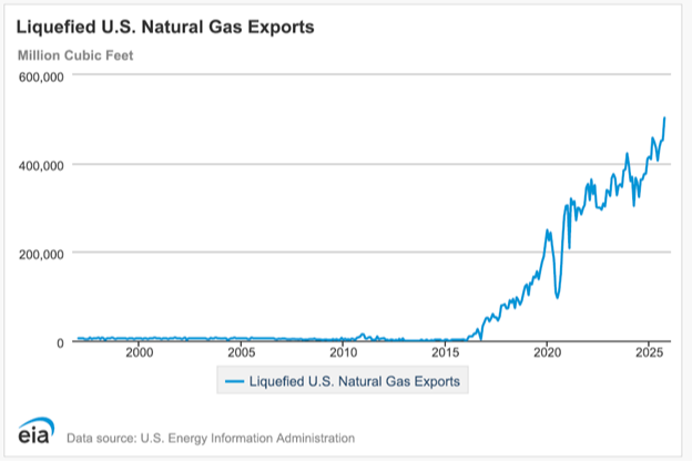 In October 2025, U.S. LNG gas export level was over 503 billion cubic feet. That was a 33.75% increase from a year ago.