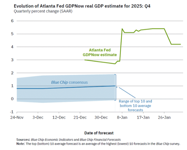 Currently, the Atlanta Fed estimates that Q4 2025 GDP growth will be 4.2% year-over-year: