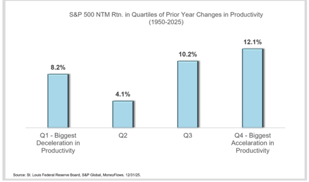 Since 1950, the S&P 500 has averaged 12% gains in the 12 months after the largest prior year productivity accelerations: