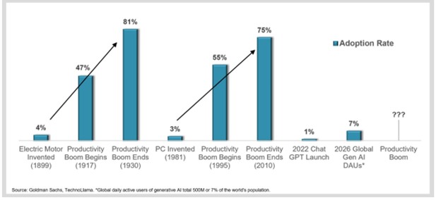 The spike in productivity taking place already is extraordinarily impressive considering productivity benefits of major new technology innovations historically don't peak until workforce penetration nears or exceeds 50%:
