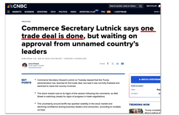 On the on the macro front, we continue seeing positive momentum. First, last week Commerce Secretary Howard Lutnick said one trade deal is actually complete: