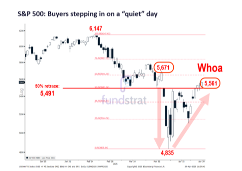 5. Stocks hit the 50% retracement level, closing above 5,491, on April 25.
