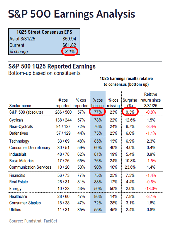 Of the reported earnings, 77% of companies beat their earnings estimates, which is in line with the five-year average and above the 10-year average of 70.5%: