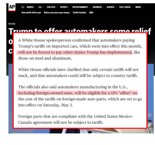 Second, the White House signed an executive order aiding autoworkers by removing the possibility of stacked tariff burdens on automakers: