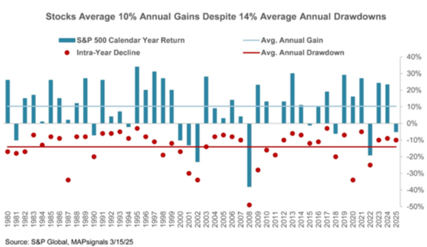 Well, since 1980 equities have averaged 10% annual gains despite median annual drawdowns of 14%: