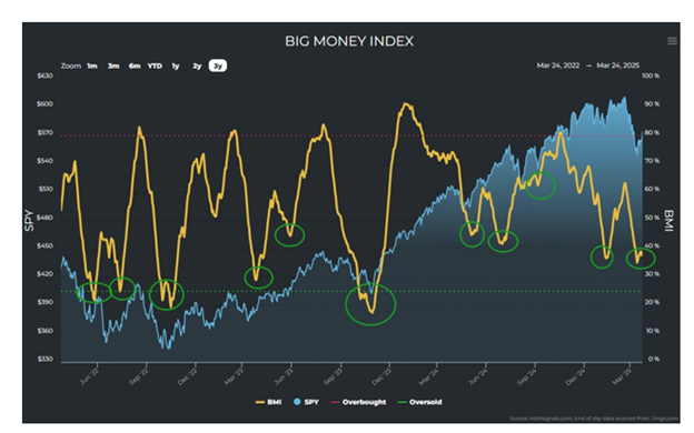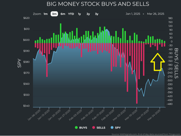 Based on this data, for the moment it appears the forced selling has washed out. This is supported by the trusty Big Money Index (BMI) from our friends at MAPsignals. The BMI is a 25-day moving average of netted “big money” investor buys and sells.