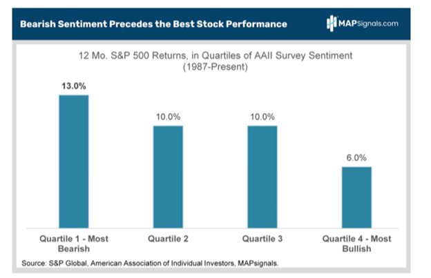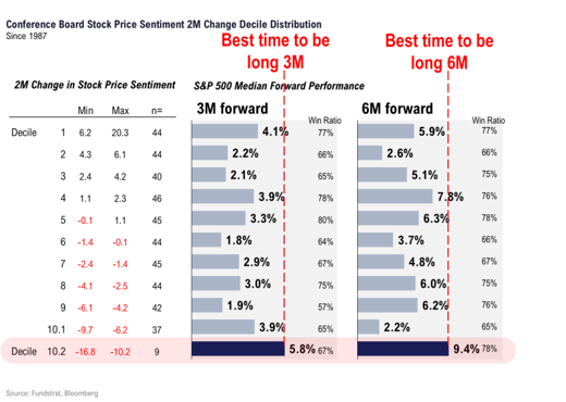 Furthermore, when there's nobody left to sell, it usually means a pickup in equities performance is soon to follow. Going back to 1987, the S&P 500 does best after top quartile bearish sentiment readings: