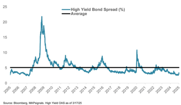 Also, there is still plenty of handwringing about how we're headed for surefire recession. Our counterpoint would be to look at the bond market, specifically tight high yield credit spreads, which show little sign of recession: