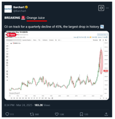 Orange juice futures dropped by 45% – the largest quarterly decline on record: