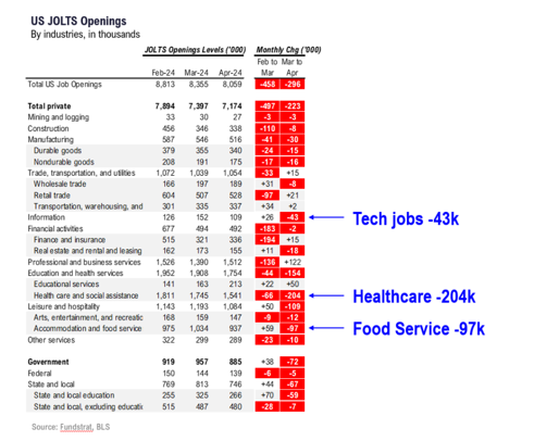 At Cornerstone, we think this April JOLTS data will begin a trend of continued downside JOLTS misses into May and June because the largest drops in openings occurred in typically “sticky” health care, food service, and technology roles: