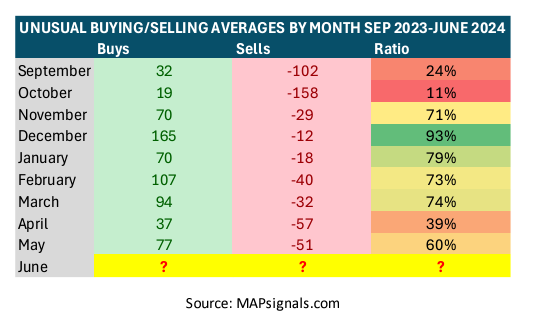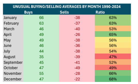 In the below table, the right column shows the ratio of buys relative to sells. Hypothetically, if six stocks were bought and four were sold, the ratio is 60%. Despite May’s weak end, the month still experienced 60% buys overall, on average: