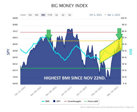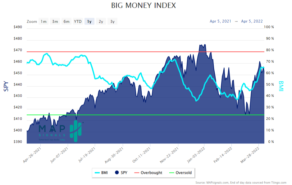 The Big Money Index (BMI) from our friends at MAPsignals helps us understand the current pulse of markets. It measures “big money” investor activity that tends to drive major index performance. As it rises, markets tend to follow, with the inverse being true as well.