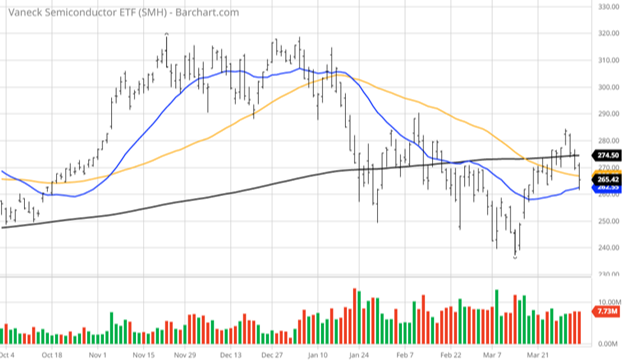 We saw an example of this recently within the semiconductor sector. There was a huge bullish rally off the mid-March low of $240, which allowed the Vaneck Semiconductor ETF (SMH), a common benchmark for semiconductors, to reclaim its 200-day moving average: