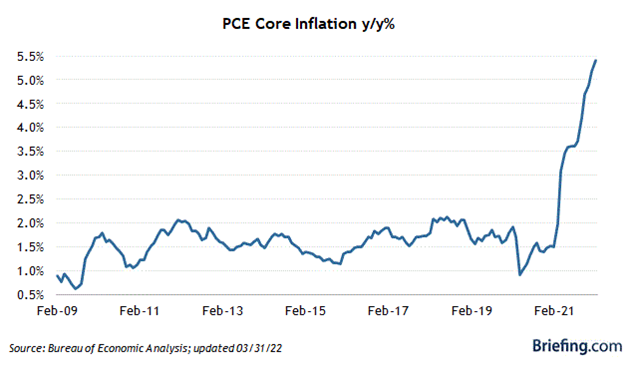 So with all that said, even with a ceasefire between Ukraine and Russia, the U.S. economy is still contending with hyperinflation, the worst in 40 years. We don't need to hammer home all the details again. But let’s note that the core personal consumption expenditures (PCE) price index, which excludes volatile food and energy, was recently up another 0.4%, pushing the year-over-year rate to 5.4% from January’s 5.3%:
