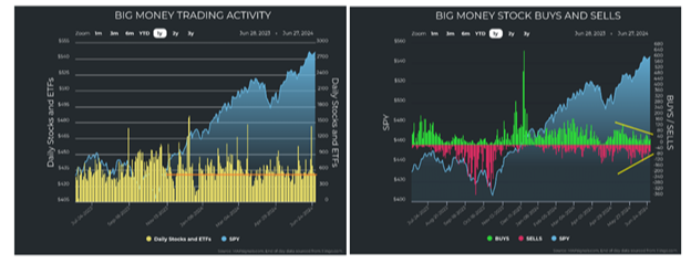 We point this out to acknowledge where things stand relative to traditional summer seasonality. As the “wedge” charts above show, buying and selling are both low and balanced. Thus, given the current data and history, we think it’s wise to not overreact as markets enter the usually bumpy months of August and September.