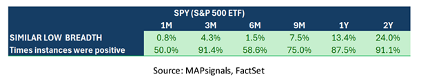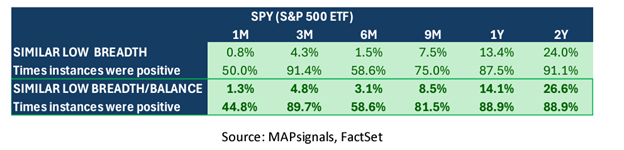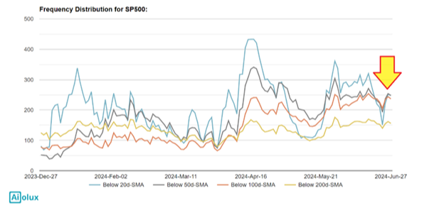 This is an early indication of short-term summer breadth weakening that can translate to lower conviction. Around half the stocks in the S&P 500 recently moved below their 50-day moving averages and remain there: