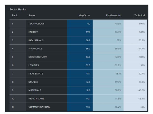 So far though, there’s good news. Sectors are holding up relatively well. Technology remains at the top, which is usually bullish due to its growth-heavy focus. Also, other cyclical sectors like energy, industrials, financials, and discretionary round out the top five:
