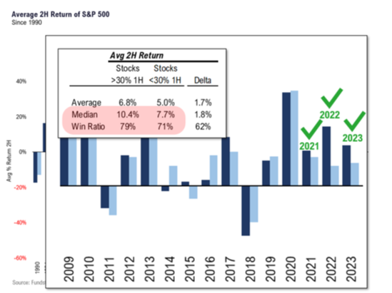 The phenomenon of first-half winners (30% gains or more) outperforming the rest of the market in the second half of the year also occurred in 2021 and 2022. In fact, since 1990 it’s happened 79% of the time: