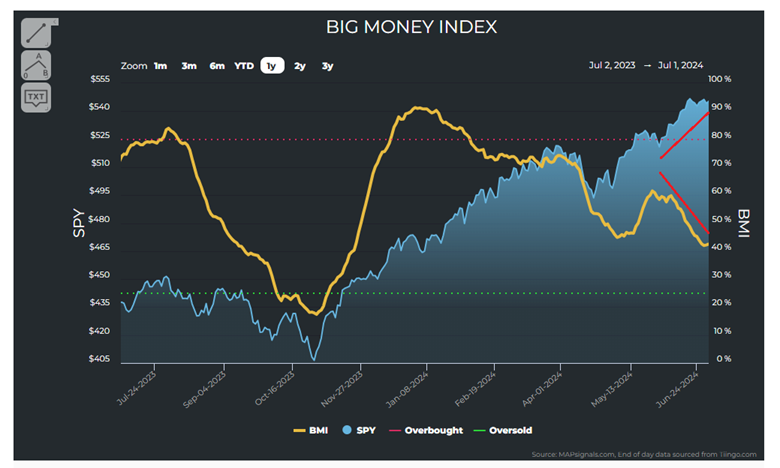 Zooming out, if we look at MAPsignals’ trusty Big Money Index (BMI), a 25-day moving average of “big money” professional investor buys and sells, it has dropped despite the market rising. It’s created a wedge pattern that’s increased in size: