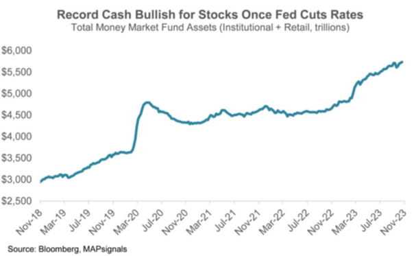 We’ve written extensively about the $5.7 trillion sitting in money market accounts. Doubters think this money stays put because it’s earning a juicy “risk-free” interest rate of 5.0% or more. Here’s what a crowded trade looks like:
